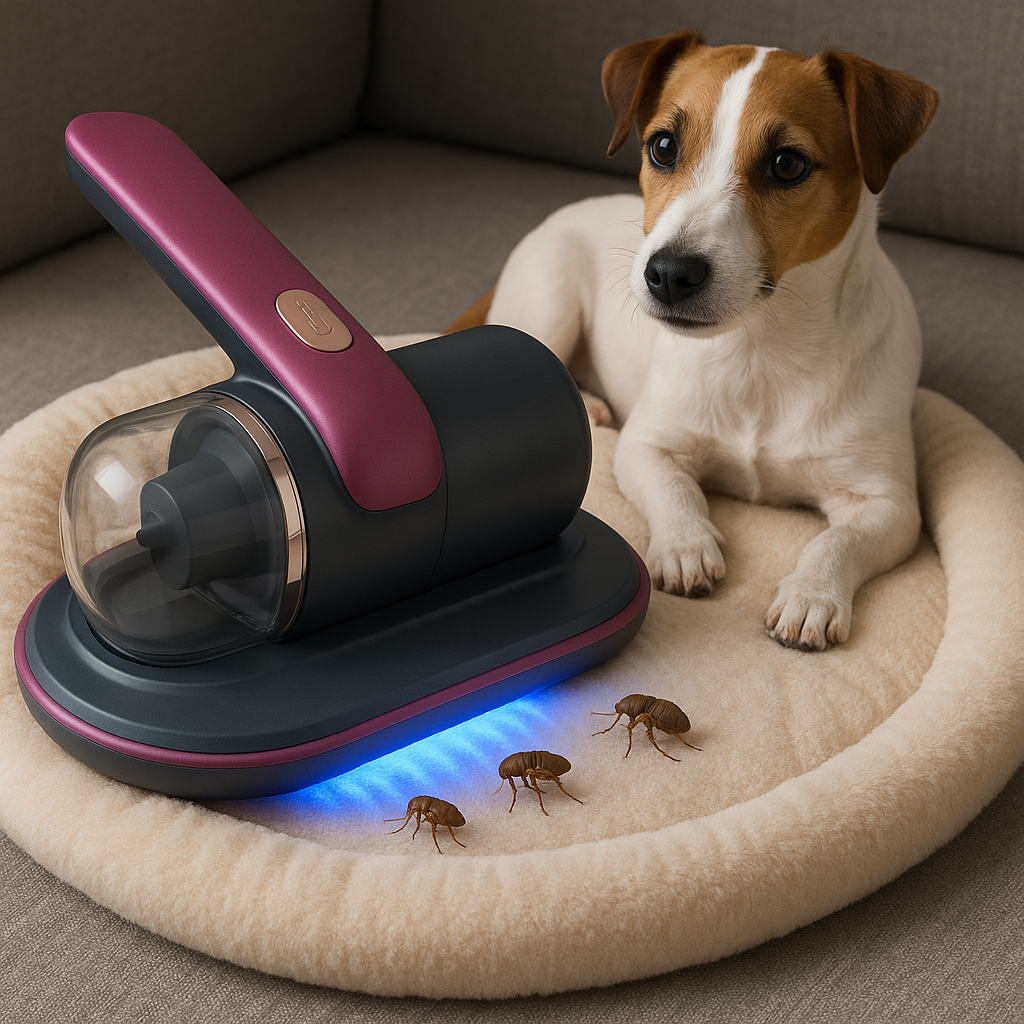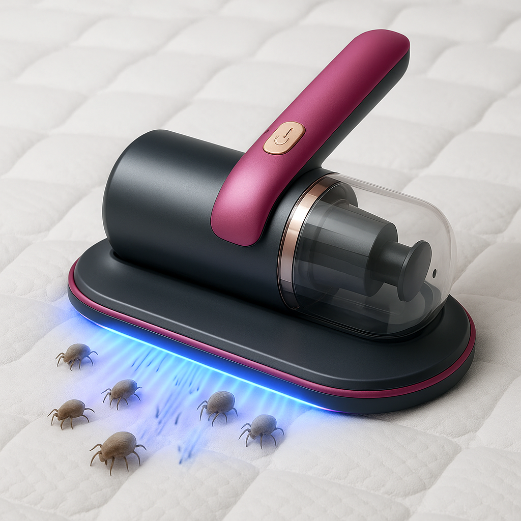Una aspiradora de mano potente con luz UV-C, diseñada para eliminar ácaros, bacterias, pulgas y otros microorganismos en colchones, sillones, camas de mascotas y más.